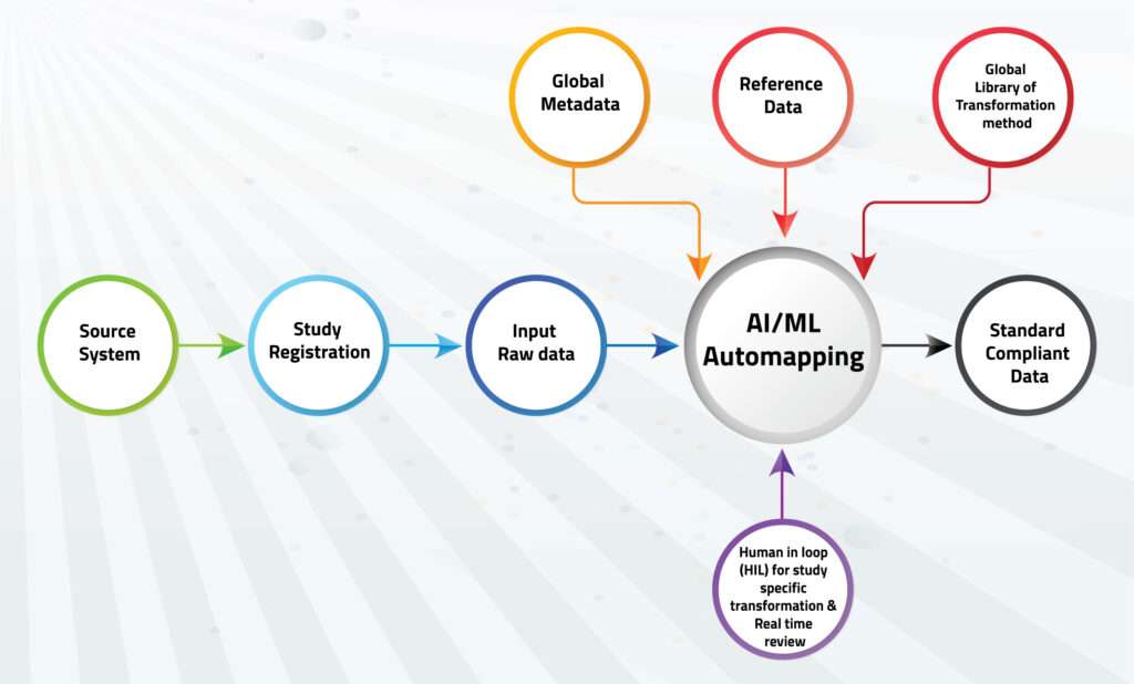The utilization of Clinical Data Standards & Machine Learning techniques along with Human in loop (HIL) approach for clinical data transformation is emerging as promising solution to address the challenges of traditional manual processes. It offers significant advantages in terms of efficiency, accuracy and standardization. ML empowers researchers and data managers to optimize standards-compliant data (such as CDISC-SDTM) generation processes. However, human oversight and interaction remain critical to ensure the accuracy and compliance of the generated standards-compliant datasets (such as CDISC-SDTM). Additionally, these approaches can handle various data formats and sources, making them more flexible and adaptable to the variability in clinical trial data. With automation through AI, Statistical programmers can manage more studies and free up team members for higher-value activities which ultimately accelerate the entire process of clinical data reporting.