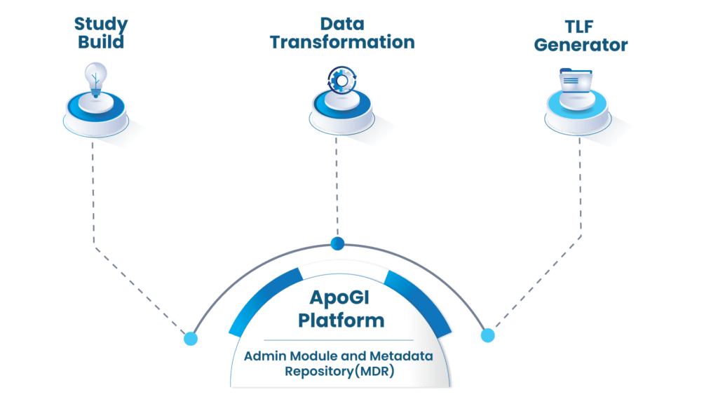 ApoGI platform consist of ADMIN, MDR, Study Build, Data transformation and TLF Shell/ Report Generator